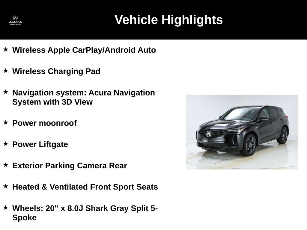 HARPER ACURA believes in the quality of the vehicles we sell so well that we provide an UNLIMITED MILES POWERTRAIN WARRANTY on every new and qualifying pre-owned vehicle it sells!!! This warranty is good at any ASE certified shop in the 48 continental United States!! Check out all these great options Exterior Parking Camera Rear, Heated & Ventilated Front Sport Seats, Navigation system: Acura Navigation System with 3D View, Power Liftgate, Power moonroof, Wheels: 20" x 8.0J Shark Gray Split 5-Spoke, 16 Speakers, 4-Wheel Disc Brakes, 4.17 Axle Ratio, ABS brakes, Air Conditioning, Alloy wheels, AM/FM radio: SiriusXM, Apple CarPlay/Android Auto, Auto High-beam Headlights, Auto-dimming Rear-View mirror, Automatic temperature control, Brake assist, Bumpers: body-color, Compass, Delay-off headlights, Driver door bin, Driver vanity mirror, Dual front impact airbags, Dual front side impact airbags, Electronic Stability Control, Emergency communication system: AcuraLink, Four wheel independent suspension, Front anti-roll bar, Front Bucket Seats, Front Center Armrest, Front dual zone A/C, Front fog lights, Front reading lights, Fully automatic headlights, Garage door transmitter: HomeLink, Heated door mirrors, Heated front seats, Illuminated entry, Knee airbag, Lane departure: Lane Keeping Assist System (LKAS) active, Low tire pressure warning, Memory seat, Occupant sensing airbag, Outside temperature display, Overhead airbag, Overhead console, Panic alarm, Passenger door bin, Passenger vanity mirror, Perforated Milano Premium Leather-Trimmed Interior, Power door mirrors, Power driver seat, Power passenger seat, Power steering, Power windows, Premium audio system: Acura/ELS Studio 3D, Radio data system, Radio: ELS Studio 3D Premium Audio System, Rear anti-roll bar, Rear reading lights, Rear seat center armrest, Rear window defroster, Rear window wiper, Remote keyless entry, Security system, Speed control, Speed-sensing steering, Split folding rear seat, Spoiler, Sport steering wheel, Steering wheel mounted audio controls, Tachometer, Telescoping steering wheel, Tilt steering wheel, Traction control, Trip computer, Turn signal indicator mirrors, Variably intermittent wipers, and Ventilated front seats. Certified.