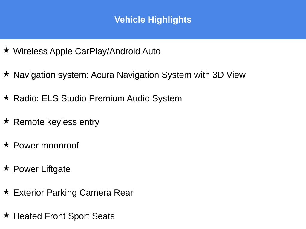 - Navigation system: Acura Navigation System with 3D View