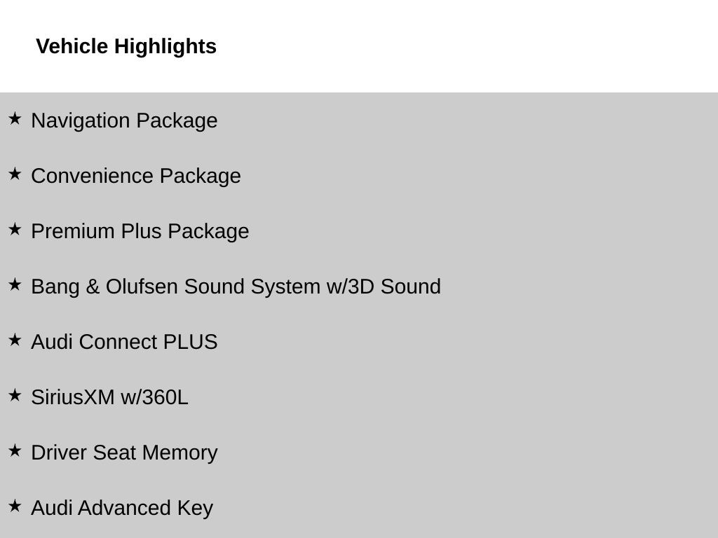 Check out all these great options Convenience Package (Adaptive Cruise Control, Alarm System w/Motion Sensor, Audi Advanced Key, Audi Side Assist w/Pre Sense Rear, Auto-Dimming Exterior Mirrors w/Memory, Driver Seat Memory, Heated Steering Wheel, Parking System Plus, and SiriusXM w/360L), Navigation Package (Audi Connect PLUS and MMI Navigation Plus), Premium Plus Package (2 Rear USB Charge Ports, Audi Active Lane Assist, Audi Phone Box, Audi Virtual Cockpit Plus, Bang & Olufsen Sound System w/3D Sound, Hands-On Detection Steering Wheel, Leatherette Covered Center Console & Door Armrests, Power Folding Exterior Mirrors, Top View Camera System, and Traffic Jam Assist), Black Optic Plus Package (20" Wheels, Black Exterior Mirror Housings & Exhaust Tips, Black Exterior Trim, Black Fender Badges, and Wheels: 20" 5-Twin-Spoke Polygon Design), 10 Speakers, 4-Wheel Disc Brakes, ABS brakes, Air Conditioning, All-Weather Floor Mats, Alloy wheels, AM/FM radio, Audi S Beam - Front Doors Only, Auto High-beam Headlights, Auto-dimming Rear-View mirror, Automatic temperature control, Brake assist, Bumpers: body-color, Cargo Mat, Compass, Delay-off headlights, Driver door bin, Driver vanity mirror, Dual front impact airbags, Dual front side impact airbags, Electronic Stability Control, Emergency communication system: Audi connect CARE, Exterior Parking Camera Rear, Four wheel independent suspension, Front anti-roll bar, Front Bucket Seats, Front Center Armrest, Front dual zone A/C, Front fog lights, Front reading lights, Garage door transmitter: HomeLink, Heated door mirrors, Heated Front S Sport Seats, Heated front seats, Illuminated entry, Integrated Toll Module Delete (DISC), Knee airbag, Leather Shift Knob, Leather steering wheel, Leather/Dinamica Seating Surfaces, Low tire pressure warning, Occupant sensing airbag, Outside temperature display, Overhead airbag, Overhead console, Panic alarm, Passenger door bin, Passenger vanity mirror, Power door mirrors, Power driver seat, Power Liftgate, Power moonroof, Power passenger seat, Power steering, Power windows, Radio data system, Radio: Audi Sound System, Rain sensing wipers, Rear air conditioning, Rear anti-roll bar, Rear reading lights, Rear seat center armrest, Rear window defroster, Remote keyless entry, Speed control, Speed-sensing steering, Speed-Sensitive Wipers, Split folding rear seat, Spoiler, Steering wheel mounted audio controls, Tachometer, Telescoping steering wheel, Tilt steering wheel, Traction control, Trip computer, Turn signal indicator mirrors, Variably intermittent wipers, and Wheels: 19" 5-Double-Arm Design Bi-Color Finish. Please contact Harper Audi at (865) 691-2834 for details. Come see why Harper has the easiest car buying experience in the South! CARFAX One-Owner. Clean CARFAX. Mythos Black Metallic quattro 8-Speed Automatic with Tiptronic 3.0L TFSI 2023 Audi S5 Sportback Premium Plus in Mythos Black Metallic, 2 Rear USB Charge Ports, Adaptive Cruise Control, Alarm System w/Motion Sensor, Audi Active Lane Assist, Audi Advanced Key, Audi Connect PLUS, Audi Phone Box, Audi Side Assist w/Pre Sense Rear, Audi Virtual Cockpit Plus, Auto-Dimming Exterior Mirrors w/Memory, Bang & Olufsen Sound System w/3D Sound, Convenience Package, Driver Seat Memory, Hands-On Detection Steering Wheel, Heated Steering Wheel, Leatherette Covered Center Console & Door Armrests, MMI Navigation Plus, Navigation Package, Parking System Plus, Power Folding Exterior Mirrors, Premium Plus Package, SiriusXM w/360L, Top View Camera System, Traffic Jam Assist.