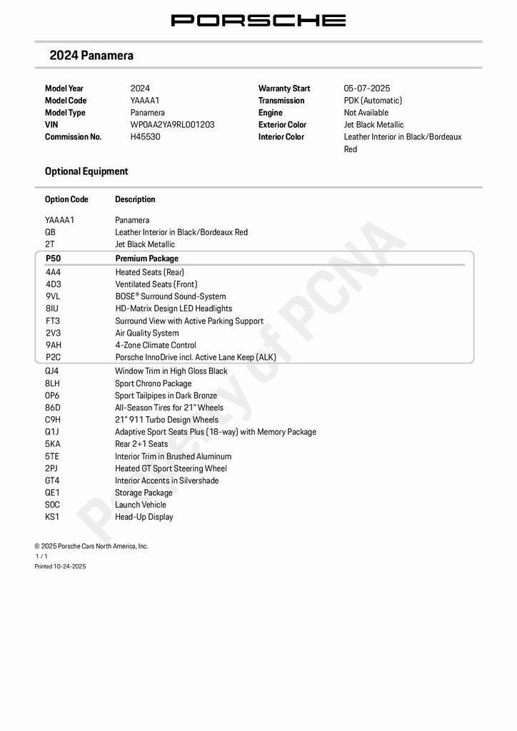 Includes Porsche Scheduled Maintenance up to 2 years/20k miles! 2024 Porsche Panamera RWD in Jet Black Metallic over Black/Bordeaux Red Full Leather interior. 2.9L V6 mated to a 8-Speed Porsche Doppelkupplung (PDK) Transmission. For all options, please view the Porsche Build Sheet located within the vehicle's photos.