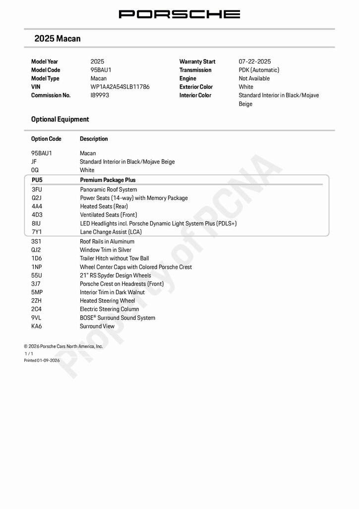 Includes Porsche Scheduled Maintenance up to 2 years/20k miles! 2025 Porsche Macan AWD in White over Black/Mojave Beige leather interior. 2.0L I4 Turbocharged mated to a 7-Speed Porsche Doppelkupplung (PDK) Transmission. For all options, please view the Porsche Build Sheet located within the vehicle's photos.