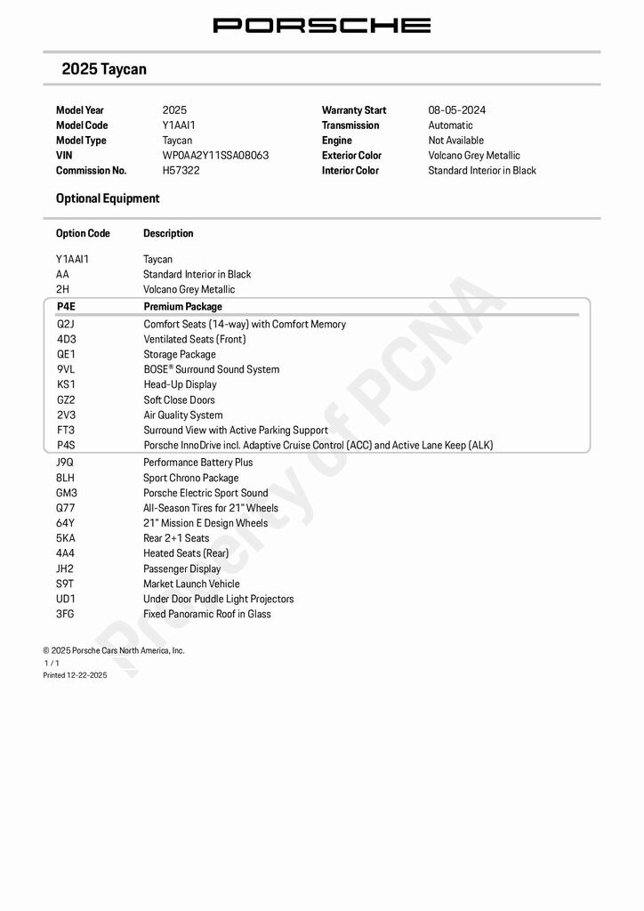 Locally owned 2025 Porsche Taycan RWD in Volcano Grey Metallic over Black leather interior. Electric Motor mated to a 2-Speed Automatic Transmission. For all options, please view the Porsche Build Sheet located within the vehicle's photos.
