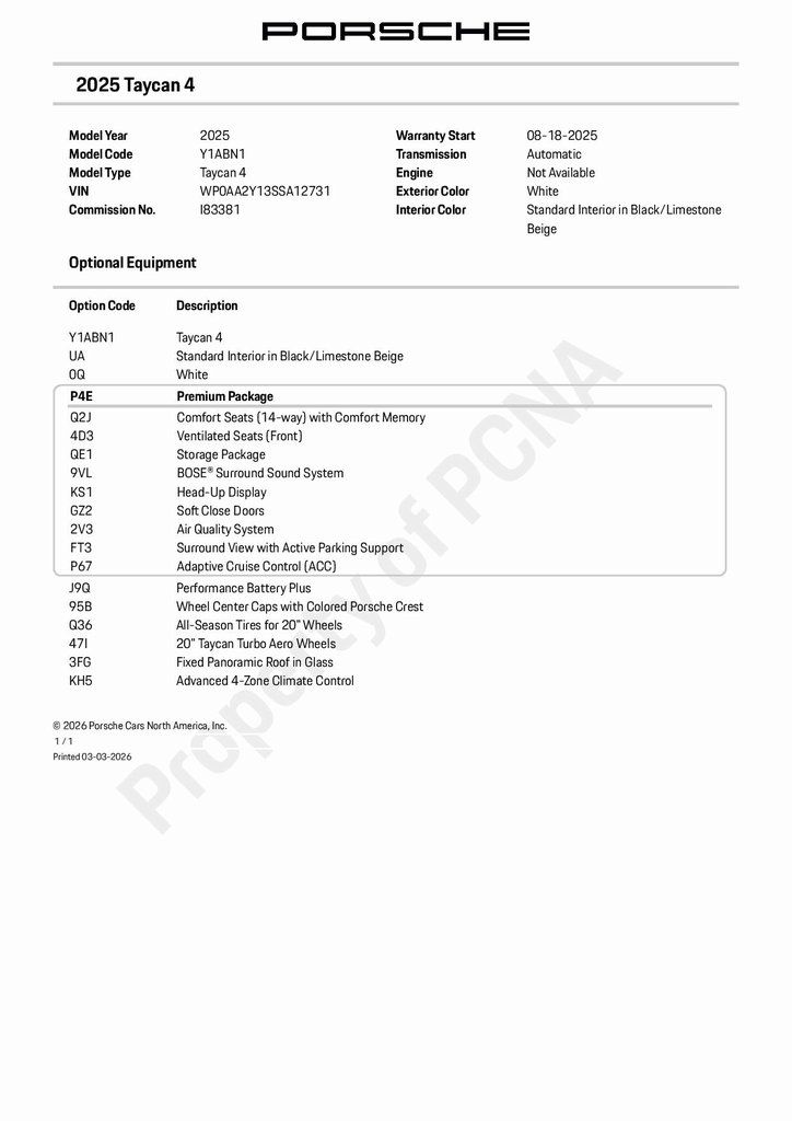 Includes Porsche Scheduled Maintenance up to 2 years/20k miles! 2025 Porsche Taycan 4 in White over Black/Limestone Beige leather interior and Performance Battery Plus! Electric Motor mated to a 2-Speed Automatic Transmission. For all options, please view the Porsche Build Sheet located within the vehicle's photos.