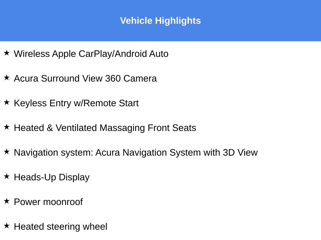 Indulge in the ultimate in comfort and convenience with the MDX Type S's comprehensive list of amenities, such as Dual-Zone Automatic Climate Control, Heated and Ventilated Front Seats, Power Liftgate, and a Blind Spot Information System with Rear Cross-Traffic Alert.