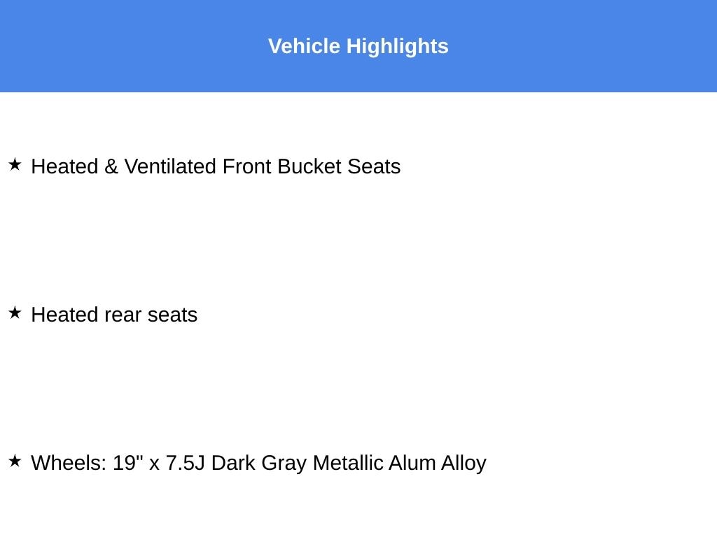 ⢠Wheels: 19" x 7.5J Dark Gray Metallic Alum Alloy