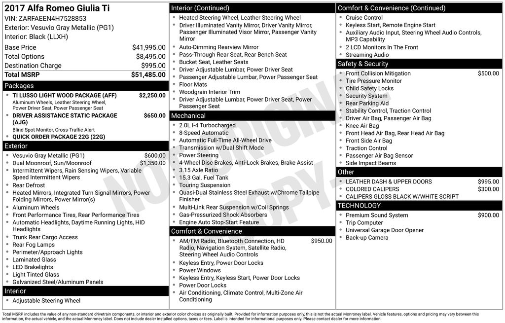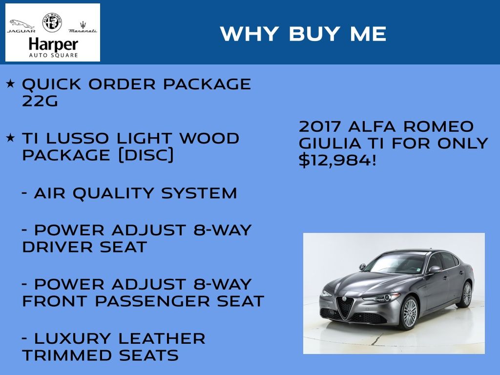 Check out all these great options Driver Assistance Static Package (Auto-Dimming Exterior Mirrors and Blind Spot & Cross Path Detection), Quick Order Package 22G, Ti Lusso Light Wood Package (DISC) (Air Quality System, Leather Dash & Upper Doors, Luxury Leather Trimmed Seats, Luxury Steering Wheel, Power Adjust 8-Way Driver Seat, Power Adjust 8-Way Front Passenger Seat, and Wheels: 18" x 8.0" Lusso Aluminum), 4-Wheel Disc Brakes, 8 Speakers, 8.8" Widescreen Color Display, ABS brakes, Air Conditioning, AM/FM radio: SiriusXM, Auto-dimming Rear-View mirror, Automatic temperature control, Bluetooth Handsfree Phone & Audio, Brake assist, Bumpers: body-color, Calipers Gloss Black w/White Script, Colored Calipers, Dual front impact airbags, Dual front side impact airbags, Dual-Pane Sunroof, Electronic Stability Control, Exterior Parking Camera Rear, Forward Collision Warning, Four wheel independent suspension, Front anti-roll bar, Front Bucket Seats, Front dual zone A/C, Fully automatic headlights, Garage door transmitter, Genuine wood console insert, Genuine wood dashboard insert, Genuine wood door panel insert, GPS Navigation, harman/kardon Premium Audio, HD Radio, Heated door mirrors, Heated front seats, Heated steering wheel, High intensity discharge headlights: Bi-Xenon, Knee airbag, Leather Dash & Upper Doors (DISC), Leather Seats, Leather steering wheel, Low tire pressure warning, Occupant sensing airbag, Outside temperature display, Overhead airbag, Panic alarm, Power door mirrors, Power driver seat, Power passenger seat, Power steering, Power windows, Radio data system, Radio: AM/FM/HD Bluetooth w/Nav 8.8, Radio: AM/FM/HD w/Bluetooth 8.8, Rain sensing wipers, Rear anti-roll ba