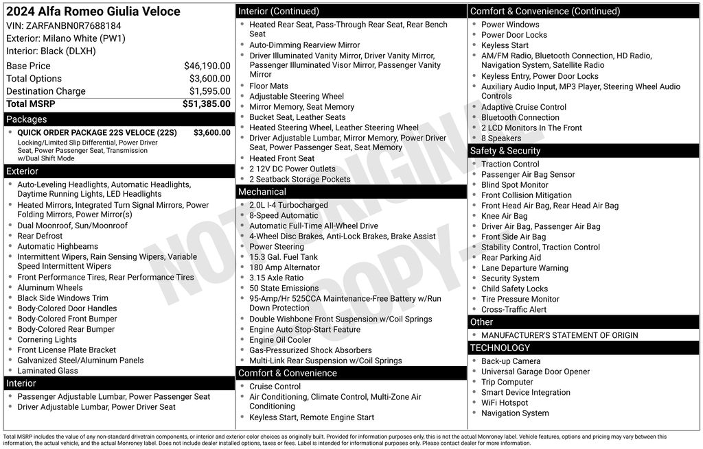 Check out all these great options Quick Order Package 22S Veloce (Aluminum Steering Column Mounted Paddle Shifters, Dark Miron V Scudetto Grille, Limited Slip Differential Rear Axle, Manual Adjustable Thigh Support, Power Adjustable Bolster, Sport Leather Seats, Veloce Rear Fascia, and Wheels: 19" x 8.0" Sport 5-Hole Aluminum), 4-Wheel Disc Brakes, 8 Speakers, ABS brakes, Air Conditioning, Alloy wheels, AM/FM radio: SiriusXM, Apple CarPlay/Android Auto, Auto High-beam Headlights, Auto-dimming door mirrors, Auto-dimming Rear-View mirror, Automatic temperature control, Brake assist, Bumpers: body-color, Delay-off headlights, Dual front impact airbags, Dual front side impact airbags, Electronic Stability Control, Exterior Parking Camera Rear, Four wheel independent suspension, Front anti-roll bar, Front Bucket Seats, Front dual zone A/C, Fully automatic headlights, Garage door transmitter, Heated door mirrors, Heated front seats, Heated rear seats, Heated steering wheel, Illuminated entry, Knee airbag, Leather Seats, Leather Shift Knob, Leather steering wheel, Low tire pressure warning, Memory seat, Navigation System, Occupant sensing airbag, Outside temperature display, Overhead airbag, Panic alarm, Passenger door bin, Power door mirrors, Power driver seat, Power moonroof, Power passenger seat, Power steering, Power windows, Radio data system, Radio: AM/FM/HD 8.8" w/Navigation, Rain sensing wipers, Rear anti-roll bar, Rear window defroster, Remote keyless entry, Security system, Speed-Sensitive Wipers, Split folding rear seat, Sport steering wheel, Steering wheel mounted audio controls, Tachometer, Telescoping steering wheel, Tilt steering wheel, Traction control, Trip computer, Turn signal indicator mirrors, Variably intermittent wipers, Compass, Driver door bin, Driver vanity mirror, Front Center Armrest, Front reading lights, Manufacturer's Statement of Origin, Overhead console, Passe