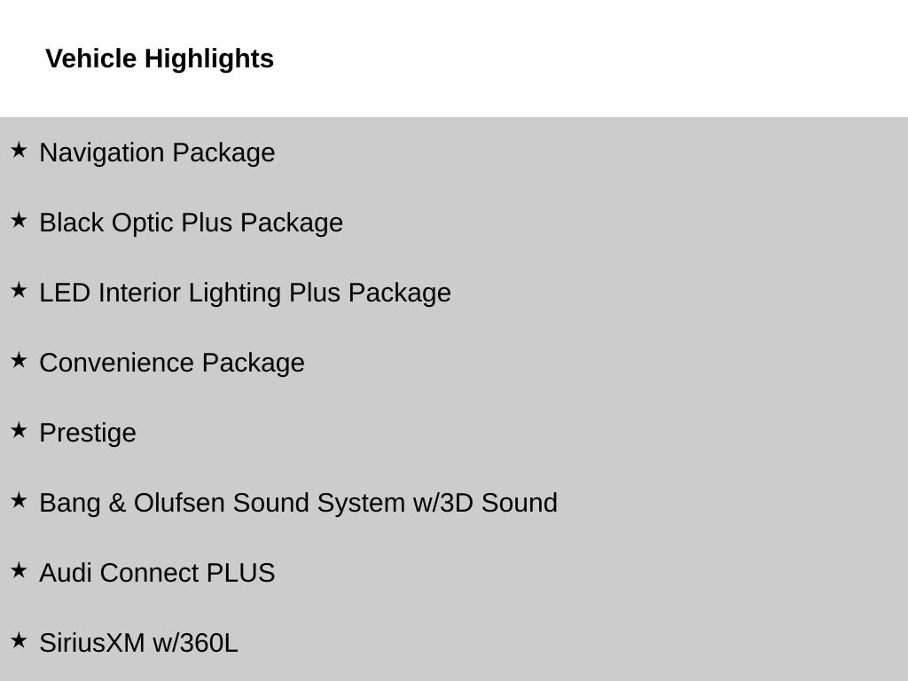 - Smart device integration: Audi smartphone interface w/wireless Apple CarPlay