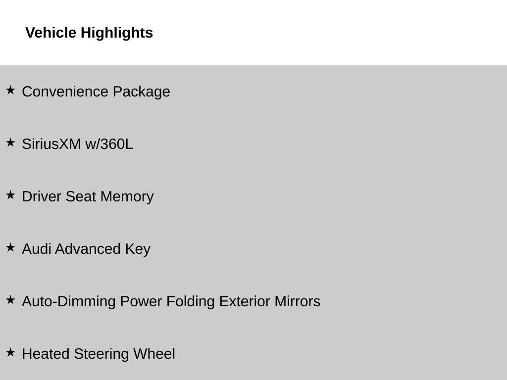 - Smart device integration: Audi smartphone interface w/wireless CarPlay