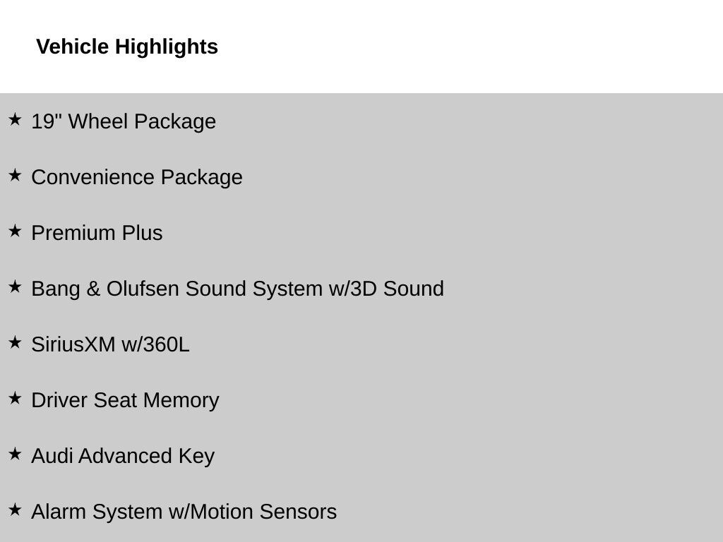 - Smart device integration: Audi smartphone interface w/wireless Apple CarPlay
