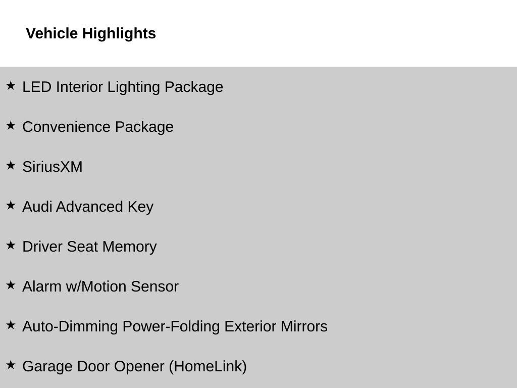 - SiriusXM, Audi Advanced Key, Driver Seat Memory, Auto-Dimming Mirrors, Wireless Phone Charging, and more