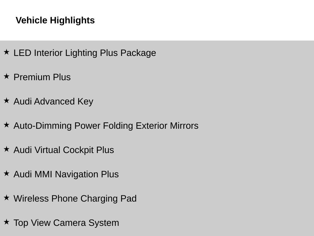 - Smart device integration: Audi smartphone interface w/wireless Apple CarPlay