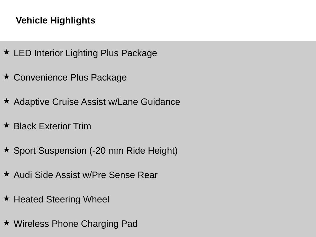 - Smart device integration: Audi smartphone interface w/wireless Apple CarPlay & Android Auto