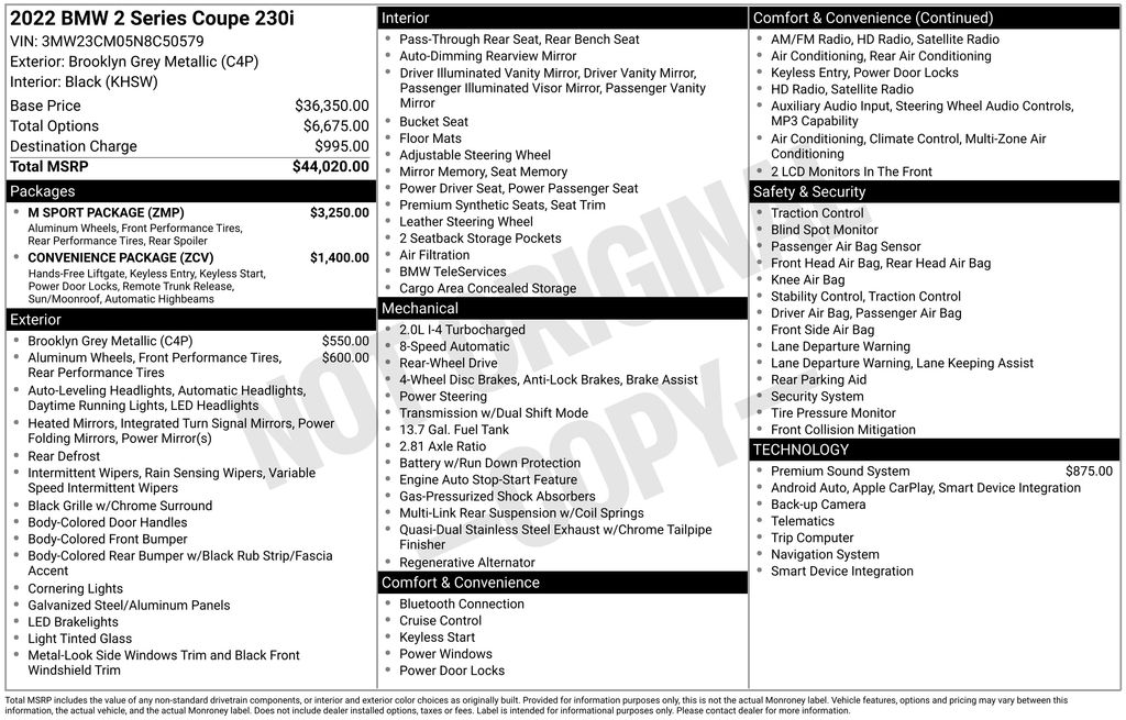 Check out all these great options Convenience Package (Ambient Lighting, Automatic High Beams, Comfort Access Keyless Entry, and Moonroof), M Sport Package (Aerodynamic Kit, M Sport Pkg, M Sport Suspension, M Steering Wheel, Rear Spoiler, Shadowline Exterior Trim, Variable Sport Steering, Wheels: 18" x 7.5" M Double-Spoke (Style 848M), and Without Lines Designation Outside), Connected Package Pro, 10 Speakers, 4-Wheel Disc Brakes, ABS brakes, Air Conditioning, Alloy wheels, AM/FM radio: SiriusXM with 360L, Apple CarPlay & Android Auto Compatibility, Auto-dimming door mirrors, Auto-dimming Rear-View mirror, Automatic temperature control, BMW Assist eCall, BMW TeleServices, Brake assist, Bumpers: body-color, ConnectedDrive Services, Delay-off headlights, Dual front impact airbags, Dual front side impact airbags, Electronic Stability Control, Emergency communication system: BMW Assist eCall, Exterior Parking Camera Rear, Four wheel independent suspension, Front anti-roll bar, Front Bucket Seats, Front dual zone A/C, Front Sport Seats, Fully automatic headlights, harman/kardon Surround Sound System, Heated door mirrors, Hi-Fi Sound System, Knee airbag, Leather Shift Knob, Low tire pressure warning, Memory seat, Navigation, Occupant sensing airbag, Outside temperature display, Overhead airbag, Panic alarm, Perforated SensaTec Upholstery, Power door mirrors, Power driver seat, Power Front Seats, Power passenger seat, Power steering, Power windows, Radio data system, Radio: AM/FM Audio System, Rain sensing wipers, Rear air conditioning, Rear anti-roll bar, Rear window defroster, Remote keyless entry, Security system, SiriusXM w/360L, Speed-Sensitive Wipers, Split folding rear seat, Sport steering wheel, Steering wheel mounted audio controls, Tachometer, Telescoping steering