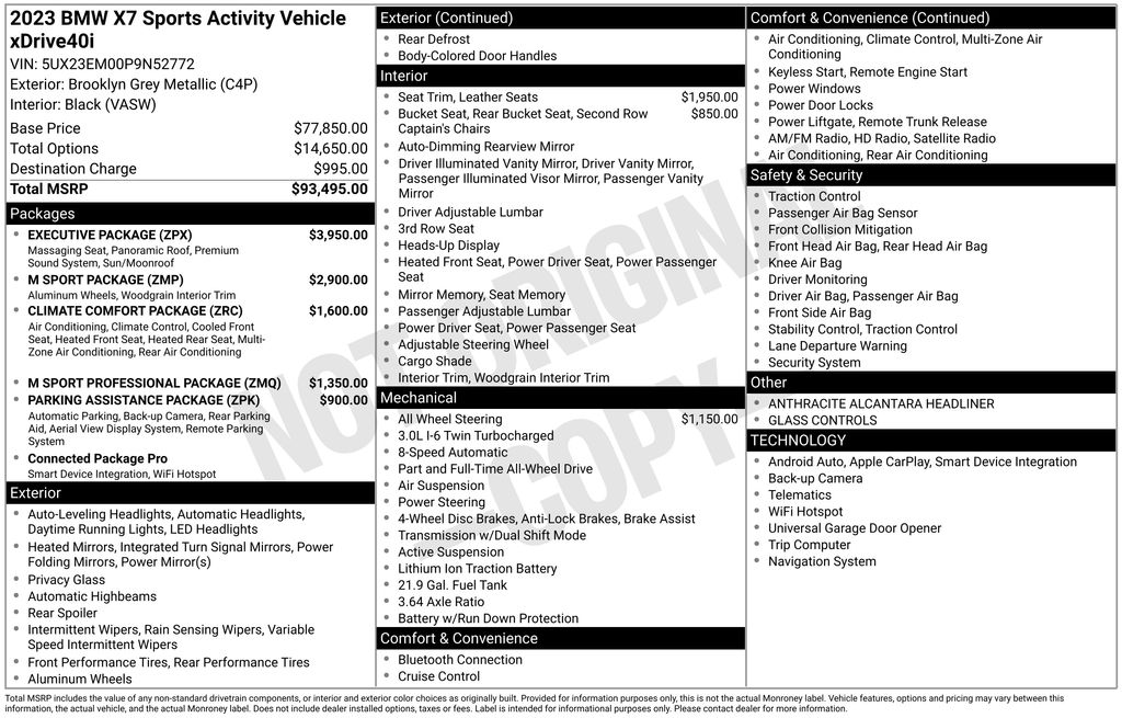 Check out all these great options Climate Comfort Package (5-Zone Automatic Climate Control, Front & Rear Heated Seats, and Front Ventilated Seats), Connected Package Pro, Executive Package (DISC) (Front Massaging Seats, Gesture Control, Glass Controls, harman/kardon Surround Sound System, Heated & Cooled Cup Holders, Panoramic Sky Lounge LED Roof, Rear Electric Side Window Shades, and Soft-Close Automatic Doors), M Sport Package (Aerodynamic Kit, Anthracite Alcantara Headliner, M Steering Wheel, Shadowline Exterior Trim, Wheels: 21" x 9.5" Double-Spoke Bi-Color Orbit Grey, and Without Lines Designation Outside), M Sport Package (337), M Sport Package Pro, M Sport Profe