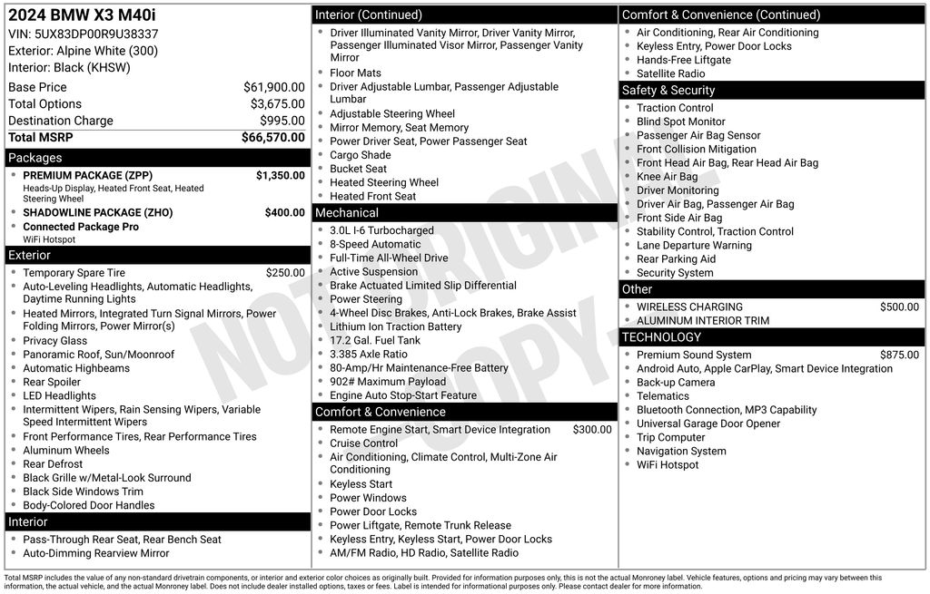 Check out all these great options Connected Package Pro, Premium Package (Head-Up Display, Heated Front Seats, and Heated Steering Wheel), Shadowline Package (Extended Shadowline Trim and M Shadowline Lights), 12 Speakers, 4-Wheel Disc Brakes, ABS brakes, Adaptive suspension, Air Conditioning, Alloy wheels, Aluminum Interior Trim, AM/FM Radio, AM/FM radio: SiriusXM, Apple CarPlay & Android Auto Compatibility, Auto High-beam Headlights, Auto-dimming door mirrors, Auto-dimming Rear-View mirror, Automatic temperature control, BMW Assist eCall, BMW TeleServices, Brake assist, Bumpers: body-color, ConnectedDrive Services, Delay-off headlights, Dual front impact airbags, Dual front side impact airbags, Electronic Stability Control, Emergency communication system: BMW Assist eCall, Enhanced USB & Bluetooth w/Smartphone Integration, Exterior Parking Camera Rear, Four wheel independent suspension, Front anti-roll bar, Front Bucket Seats, Front Center Armrest, Front dual zone A/C, Fully automatic headlights, harman/kardon Surround Sound System, Heated door mirrors, Hi-Fi Sound System, Knee airbag, Leather steering wheel, Live Cockpit Pro w/Navigation, Low tire pressure warning, Lumbar Support, Memory seat, Navigation System, Occupant sensing airbag, Outside temperature display, Overhead airbag, Panic alarm, Perforated SensaTec Upholstery, Power door mirrors, Power driver seat, Power Front Seats, Power Liftgate, Power moonroof, Power passenger seat, Power steering, Power windows, Radio data system, Rain sensing wipers, Rear air condition