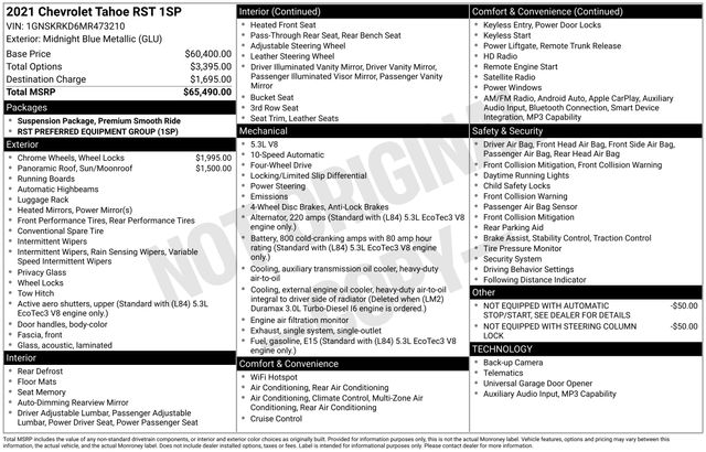 I purchased a 21 Chevy Tahoe LT October 2020 and my only regret is not getting an RST with sunroof and ventilated seats. Coming from a Silverado RST I prefer the more aggressive appearance. The ride is night and day compared to the Silverado and previous Tahoes I've driven. Smooth handing, very confident in corners, absorbs most bumps well. The Tahoe finally feels premium on the inside, even in the LT trim. Soft touch material everywhere! Tech is finally on par and or better than competitors without going to extreme. The infotainment system isn't perfect but it's smooth and glitch free. Wireless Android auto is the best! Overall the truck is very accommodating in all 3 rows at 6' 2" 270 lbs I approve the third row. I just wish the seating was a little more plush in all rows. Fuel economy is as expected about 16-17 mpg could do better if I ease off the gas. For a mix of Tampa highway and city driving that's not bad. Would love to see a serious Hybrid not like previous poorly executed models. - 5.0