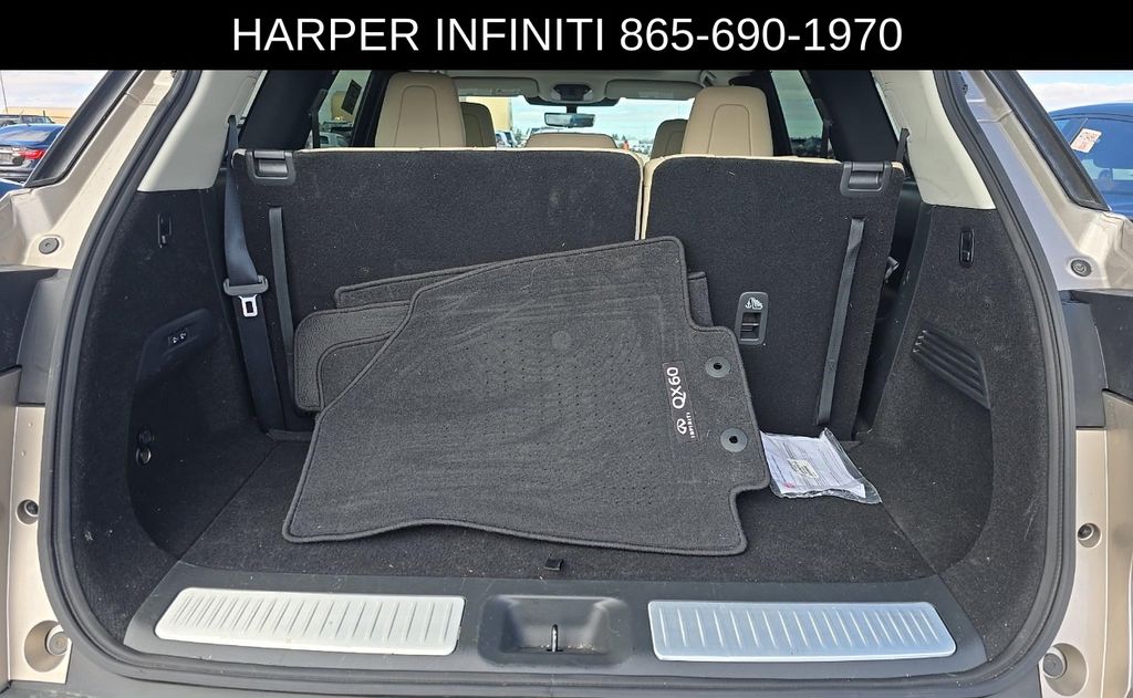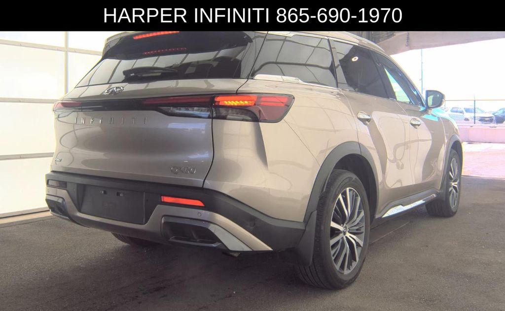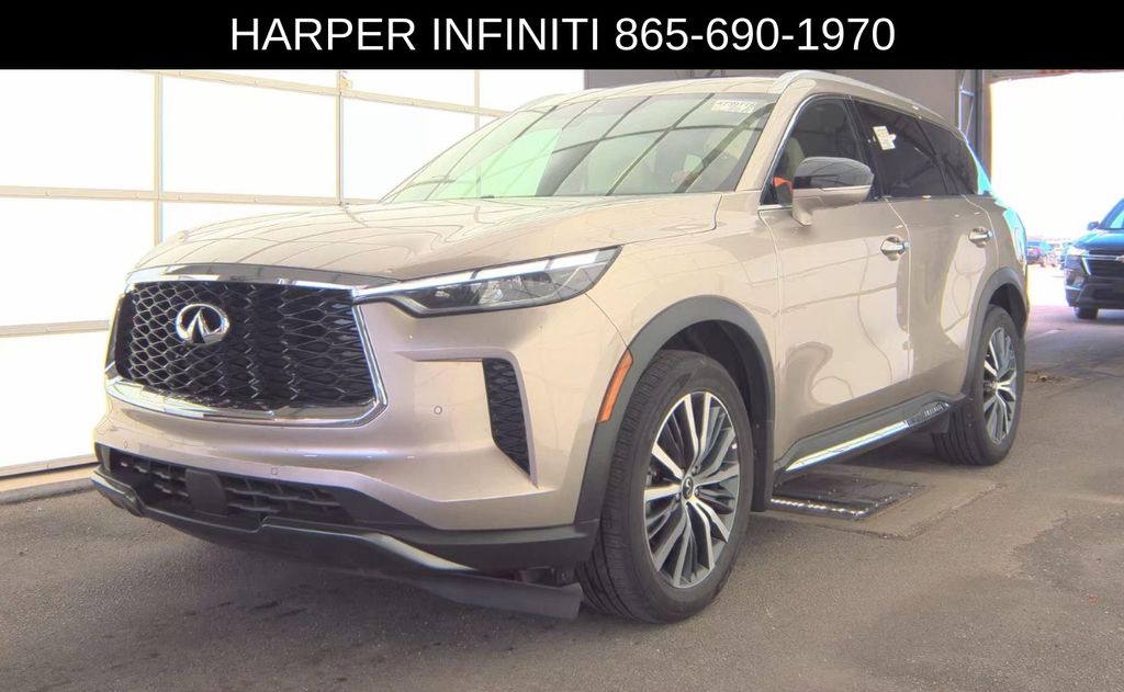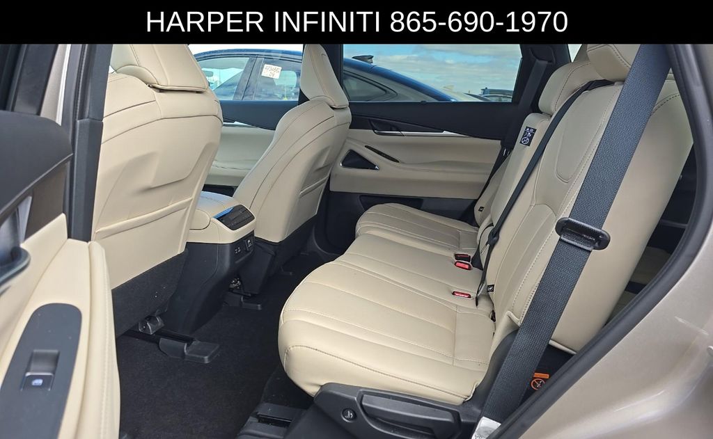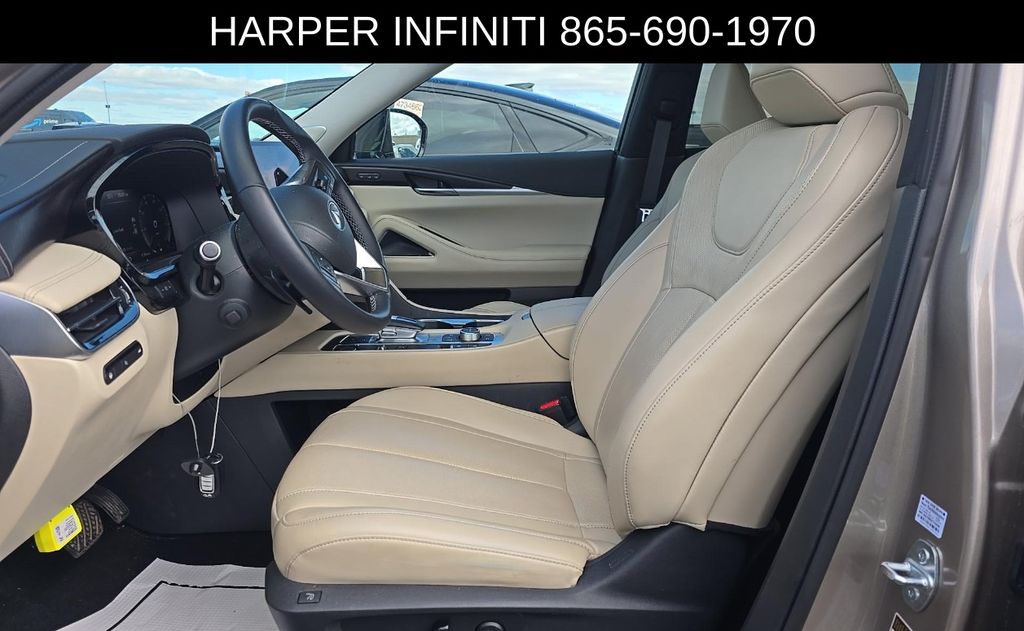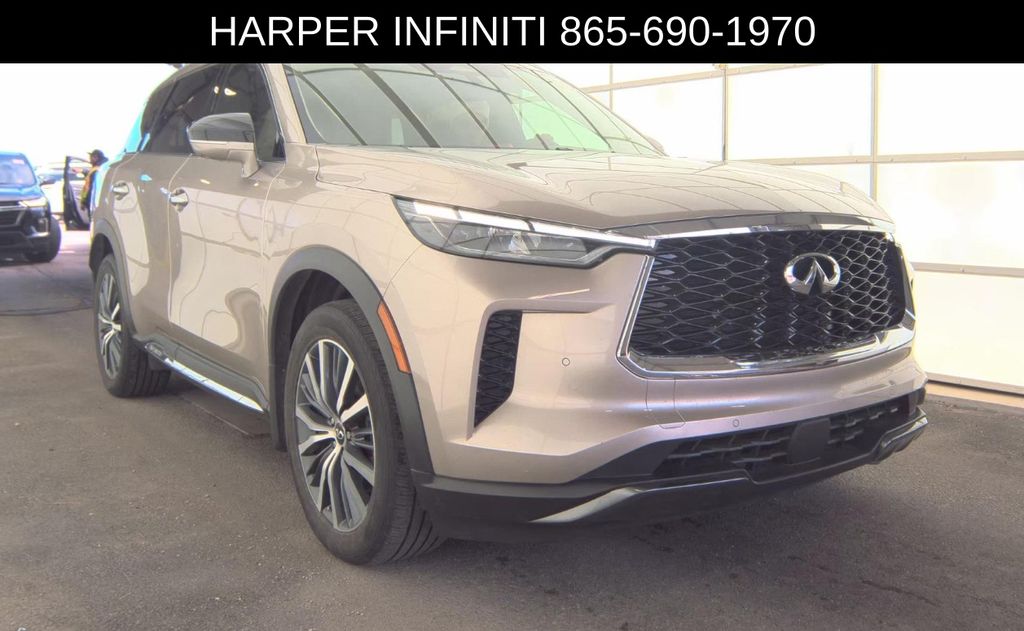 Harper INFINITI is excited to offer this gorgeous 2023 INFINITI QX60 in Champagne HARPER INFINITI believes in the quality of the vehicles we sell so well that we provide an UNLIMITED MILES, POWERTRAIN WARRANTY on every new and qualifying pre-owned vehicle it sells!!! This warranty is good at any ASE certified shop in the 48 continental United States!! Check out all these great options Vision Package (10.8" Head-Up Display, Adaptive Front Lighting System, and Smart Rear View Mirror), Navigation system: INFINITI InTouch Navigation, 17 Speakers, 3rd row seats: bench, 4-Wheel Disc Brakes, 4.334 Axle Ratio, ABS brakes, Air Conditioning, Alloy wheels, AM/FM radio: SiriusXM, Anti-whiplash front head restraints, Auto High-beam Headlights, Auto-dimming door mirrors, Auto-dimming Rear-View mirror, Automatic temperature control, Bose Performance Series 17-Speaker Sound System, Brake assist, Bumpers: body-color, Climate-Controlled Front Bucket Seats, Delay-off headlights, Driver door bin, Driver vanity mirror, Dual front impact airbags, Dual front side impact airbags, Electronic Stability Control, Emergency communication system, Floor Mats on Bench Seats w/3rd Row Tray, Four wheel independent suspension, Front anti-roll bar, Front Bucket Seats, Front Center Armrest, Front dual zone A/C, Front reading lights, Fully automatic headlights, Garage door transmitter: HomeLink, Heated door mirrors, Heated front seats, Heated rear seats, Heated steering wheel, Illuminated entry, Illuminated Kick Plate, Knee airbag, Leather Shift Knob, Leather steering wheel, Leather-Appointed Seating Surfaces, Literature Kit, Low tire pressure warning, Memory seat, Occupant sensing airbag, Outside temperature display, Overhead airbag, Overhead console, Panic alarm, Passenger door bin, Passenger vanity mirror, Power door mirrors, Power driver seat, Power Liftgate, Power moonroof, Power passenger seat, Power steering, Power windows, Radio data system, Radio: AM/FM Audio System, Rain sensing wipers, Rear air conditioning, Rear anti-roll bar, Rear reading lights, Rear seat center armrest, Rear side impact airbag, Rear window defroster, Rear window wiper, Reclining 3rd row seat, Remote keyless entry, Security system, Speed control, Speed-sensing steering, Speed-Sensitive Wipers, Splash Guards, Split folding rear seat, Spoiler, Steering wheel memory, Steering wheel mounted audio controls, Tachometer, Telescoping steering wheel, Tilt steering wheel, Traction control, Trip computer, Turn signal indicator mirrors, Variably intermittent wipers, Ventilated front seats, and Wheels: 20" x 8J Luxury Machined Aluminum Alloy.