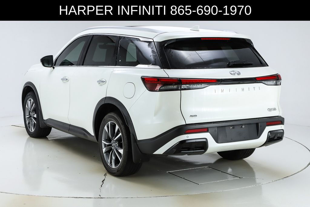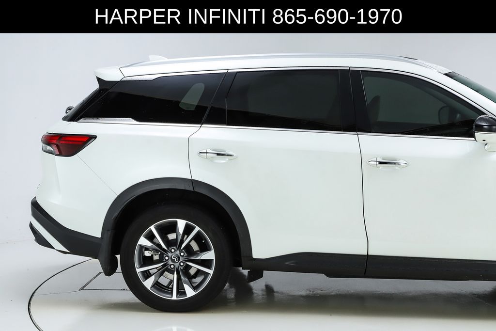 Harper INFINITI is proud to offer this handsome 2023 INFINITI QX60 in Majestic White HARPER INFINITI believes in the quality of the vehicles we sell so well that we provide an UNLIMITED MILES, POWERTRAIN WARRANTY on every new and qualifying pre-owned vehicle it sells!!! This warranty is good at any ASE certified shop in the 48 continental United States!! Check out all these great options Navigation system: INFINITI InTouch Navigation, 3rd row seats: bench, 4-Wheel Disc Brakes, 4.334 Axle Ratio, 9 Speakers, ABS brakes, Air Conditioning, Alloy wheels, AM/FM radio: SiriusXM, Anti-whiplash front head restraints, Auto High-beam Headlights, Auto-dimming door mirrors, Auto-dimming Rear-View mirror, Automatic temperature control, Brake assist, Bumpers: body-color, Climate-Controlled Front Bucket Seats, Delay-off headlights, Driver door bin, Driver vanity mirror, Dual front impact airbags, Dual front side impact airbags, Electronic Stability Control, Emergency communication system, Floor Mats on Bench Seats w/3rd Row Tray, Four wheel independent suspension, Front anti-roll bar, Front Bucket Seats, Front Center Armrest, Front dual zone A/C, Front reading lights, Fully automatic headlights, Garage door transmitter: HomeLink, Heated door mirrors, Heated front seats, Heated steering wheel, Illuminated entry, Knee airbag, Leather Shift Knob, Leather steering wheel, Leather-Appointed Seating Surfaces, Literature Kit, Low tire pressure warning, Memory seat, Occupant sensing airbag, Outside temperature display, Overhead airbag, Overhead console, Panic alarm, Passenger door bin, Passenger vanity mirror, Power door mirrors, Power driver seat, Power Liftgate, Power moonroof, Power passenger seat, Power steering, Power windows, Radio data system, Radio: AM/FM Audio System, Rain sensing wipers, Rear air conditioning, Rear anti-roll bar, Rear reading lights, Rear seat center armrest, Rear side impact airbag, Rear window defroster, Rear window wiper, Reclining 3rd row seat, Remote keyless entry, Security system, Speed control, Speed-sensing steering, Speed-Sensitive Wipers, Splash Guards, Split folding rear seat, Spoiler, Steering wheel memory, Steering wheel mounted audio controls, Tachometer, Telescoping steering wheel, Tilt steering wheel, Traction control, Trip computer, Turn signal indicator mirrors, Variably intermittent wipers, Ventilated front seats, and Wheels: 20" x 8J Sporty Machined Aluminum Alloy.