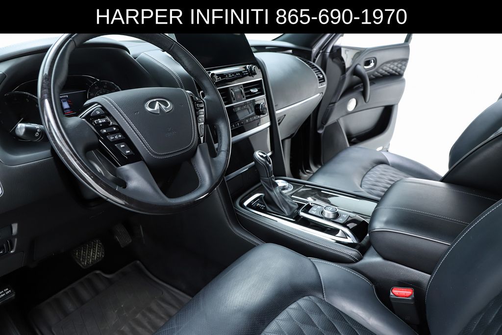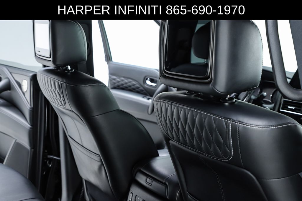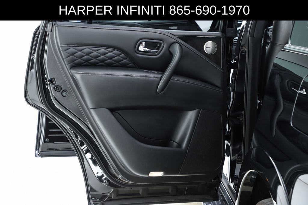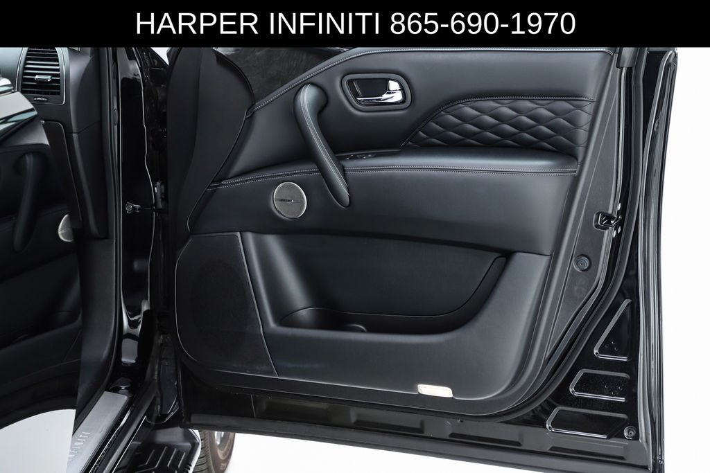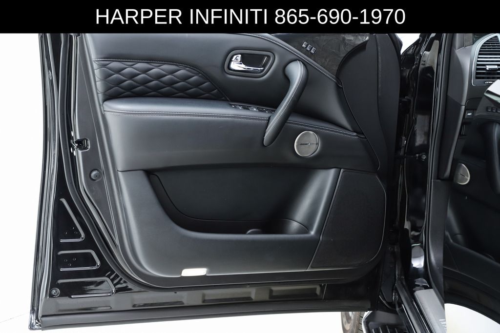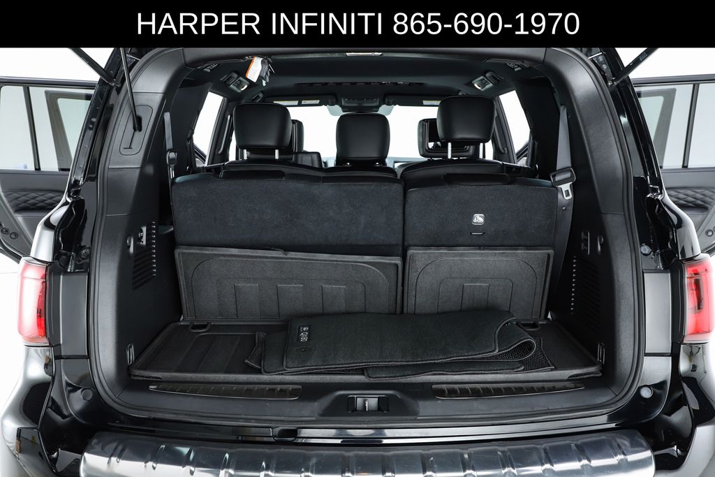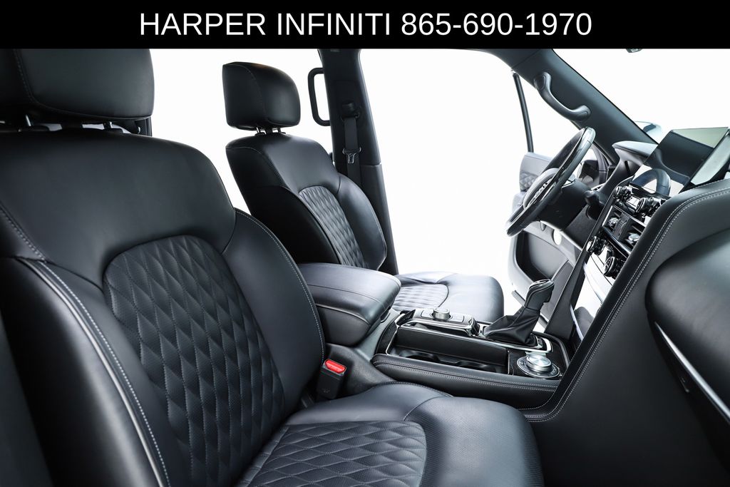 Harper INFINITI is pumped up to offer this great-looking 2023 INFINITI QX80 in Black Obsidian HARPER INFINITI believes in the quality of the vehicles we sell so well that we provide an UNLIMITED MILES, POWERTRAIN WARRANTY on every new and qualifying pre-owned vehicle it sells!!! This warranty is good at any ASE certified shop in the 48 continental United States!! Check out all these great options Cargo Package (Cargo Net, Carpeted Cargo Mat, Center Console Tray, Console Net, and First-Aid Kit), Split Bench Seat Package, Navigation system: INFINITI InTouch Navigation, 17 Speakers, 2.937 Axle Ratio, 3rd row seats: split-bench, 4-Wheel Disc Brakes, ABS brakes, Air Conditioning, Alloy wheels, AM/FM radio: SiriusXM, Anti-whiplash front head restraints, Auto High-beam Headlights, Auto tilt-away steering wheel, Auto-dimming door mirrors, Auto-dimming Rear-View mirror, Auto-leveling suspension, Automatic temperature control, Brake assist, Bumpers: body-color, Climate Controlled Front Bucket Seats, Compass, Delay-off headlights, Driver door bin, Driver vanity mirror, Dual front impact airbags, Dual front side impact airbags, Electronic Stability Control, Emergency communication system: INFINITI InTouch, Four wheel independent suspension, Front anti-roll bar, Front Bucket Seats, Front Center Armrest, Front dual zone A/C, Front fog lights, Front reading lights, Fully automatic headlights, Garage door transmitter: HomeLink, Heated door mirrors, Heated front seats, Heated rear seats, Heated steering wheel, Illuminated entry, INFINITI Radiant Illuminated Kick Plates, Leather Shift Knob, Leather steering wheel, Literature Kit, Low tire pressure warning, Memory seat, Occupant sensing airbag, Outside temperature display, Overhead airbag, Overhead console, Panic alarm, Passenger door bin, Passenger vanity mirror, Perforated Semi-Aniline Leather-Appointed Seats, Power door mirrors, Power driver seat, Power Liftgate, Power moonroof, Power passenger seat, Power steering, Power windows, Premium audio system: Bose, Radio data system, Radio: Bose Performance Audio System w/17 Speakers, Rain sensing wipers, Rear air conditioning, Rear anti-roll bar, Rear reading lights, Rear seat center armrest, Rear window defroster, Rear window wiper, Rear-Seat Entertainment, Reclining 3rd row seat, Remote keyless entry, Security system, Speed control, Speed-sensing steering, Split folding rear seat, Spoiler, Steering wheel memory, Steering wheel mounted audio controls, Tachometer, Telescoping steering wheel, Tilt steering wheel, Traction control, Trip computer, Turn signal indicator mirrors, Variably intermittent wipers, Ventilated front seats, Voltmeter, and Wheels: 22" x 8.0" Dark Chrome Cast Aluminum-Alloy.
