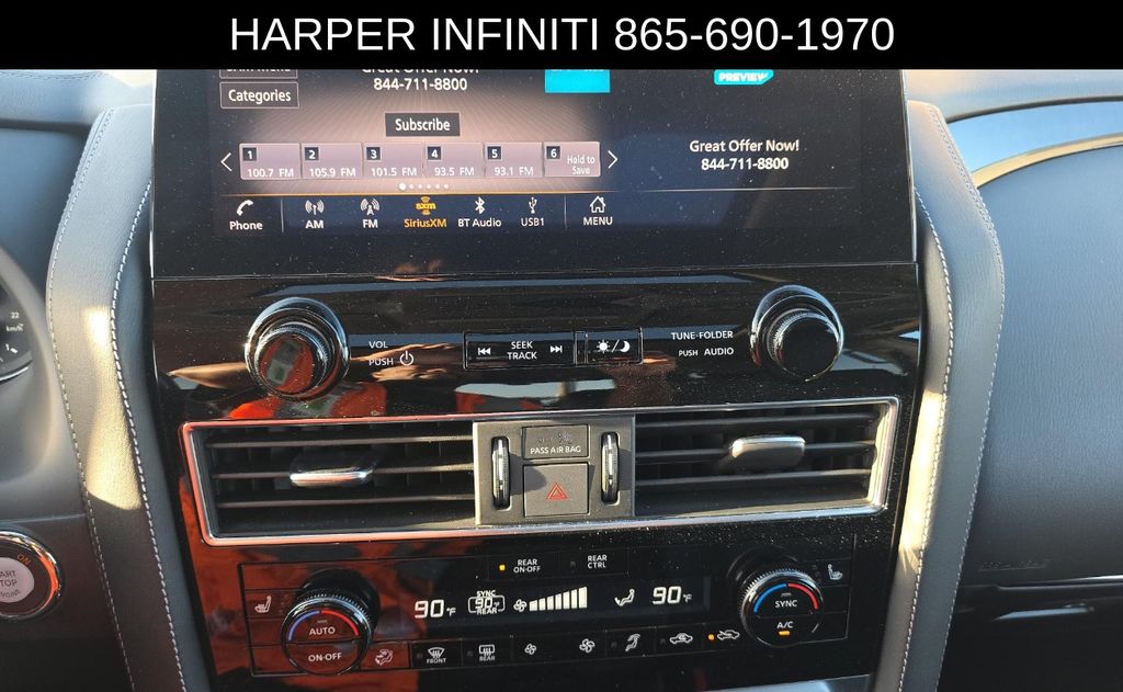 Harper INFINITI is excited to offer this stunning 2024 INFINITI QX80 LUXE in Black. HARPER INFINITI believes in the quality of the vehicles we sell so well that we provide an UNLIMITED MILES, POWERTRAIN WARRANTY on every new and qualifying pre-owned vehicle it sells!!! This warranty is good at any ASE certified shop in the 48 continental United States!! Check out all these great options: INFINITI RADIANT ILLUMINATED KICK PLATES (N93), CARGO PACKAGE, 13 Speakers, AM/FM radio: SiriusXM, Radio data system, Radio: Bose Premium Audio System w/13 Speakers, 2.937 Axle Ratio, Air Conditioning, Automatic temperature control, Front dual zone A/C, Rear air conditioning, Rear window defroster, Memory seat, Power driver seat, Power steering, Power windows, Remote keyless entry, Steering wheel memory, Steering wheel mounted audio controls, Speed control, Power Liftgate, Brake assist, Electronic Stability Control, Auto-leveling suspension, Four wheel independent suspension, Speed-sensing steering, Traction control, Auto High-beam Headlights, Delay-off headlights, Front fog lights, Fully automatic headlights, Auto-dimming door mirrors, Bumpers: body-color, Heated door mirrors, Power door mirrors, Spoiler, Turn signal indicator mirrors, Apple CarPlay/Android Auto, Auto tilt-away steering wheel, Auto-dimming Rear-View mirror, Compass, Console Net, Driver door bin, Driver vanity mirror, Front reading lights, Garage door transmitter: HomeLink, Heated steering wheel, Illuminated entry, Leather Shift Knob, Leather steering wheel, Moisture-Resistant Rear Cargo Carpet, Outside temperature display, Overhead console, Passenger vanity mirror, Rear reading lights, Rear seat center armrest, Tachometer, Telescoping steering wheel, Tilt steering wheel, Trip computer, Voltmeter, Navigation system: INFINITI InTouch Navigation, Cargo Package, 4-Wheel Disc Brakes, ABS brakes, Anti-whiplash front head restraints, Dual front impact airbags, Dual front side impact airbags, Emergency communication system: INFINITI InTouch, Front anti-roll bar, Low tire pressure warning, Occupant sensing airbag, Overhead airbag, Rear anti-roll bar, 3rd row seats: bench, Front Bucket Seats, Front Center Armrest, Heated Front Bucket Seats, Heated front seats, Leather-Appointed Seats, Power passenger seat, Reclining 3rd row sea