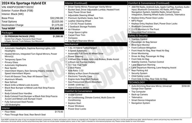 Powered by a fuel-efficient I4 engine and paired with a 6-speed automatic transmission, the Sportage Hybrid EX delivers an impressive 38 MPG in the city and on the highway, making it an exceptional choice for those seeking exceptional efficiency without sacrificing performance or capability. The advanced all-wheel-drive system ensures confident handling in a variety of road conditions, while the four-wheel independent suspension provides a smooth, composed ride.