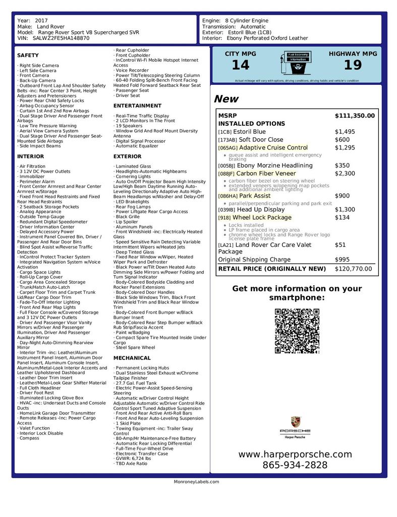 Inspected by our Porsche Certified technicians, all maintenance up to date, and extended vehicle service contracts are available for further peace of mind (if eligible). Our Pre-Owned vehicles are priced to market, making the transaction as transparent and hassle-free as possible. Please call Harper Porsche for details (865) 934-2828 or visit us online at www.harperporsche.com. Dealer not responsible for automated VIN populated options list. Buyer to verify specs with Sales Consultant. Come see why Harper has the easiest car buying experience in the South!